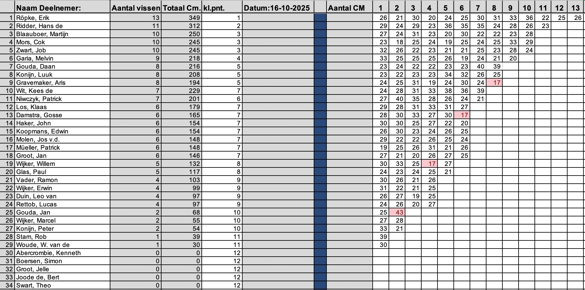De laatste podium plek werd spannend want drie vissers wisten tien vissen op het droge te krijgen. Het was Martijn Blaauboer die met 250 centimeter het podium compleet maakte.