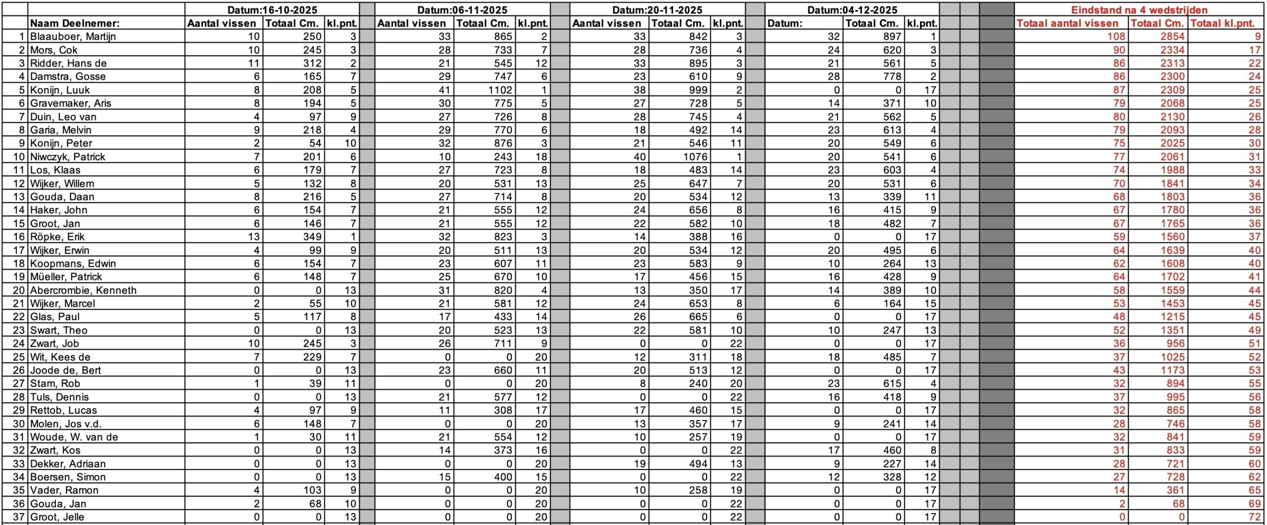 Luuk Konijn was door ziekte afwezig en kon zijn koppositie in het klassement niet verdedigen. Door de vierde wedstrijd met 32 vissen als winnaar af te sluiten wist Martijn Blaauboer niet alleen de vierde wedstrijd te winnen maar werd ook winnaar van de Spock Midnight Seafight 2026! Gosse Damstra behaalde met 28 vissen een tweede plek en Cok Mors werd derde met 24 stuks tijdens deze vierde wedstrijd.